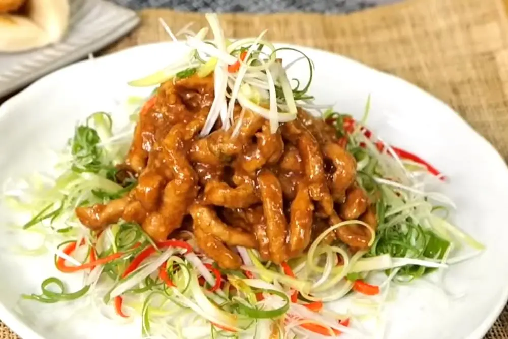 4、最后下肉丝、绍兴酒拌炒均匀,将葱丝辣椒丝垫底,上面铺上炒好的肉丝即完成。