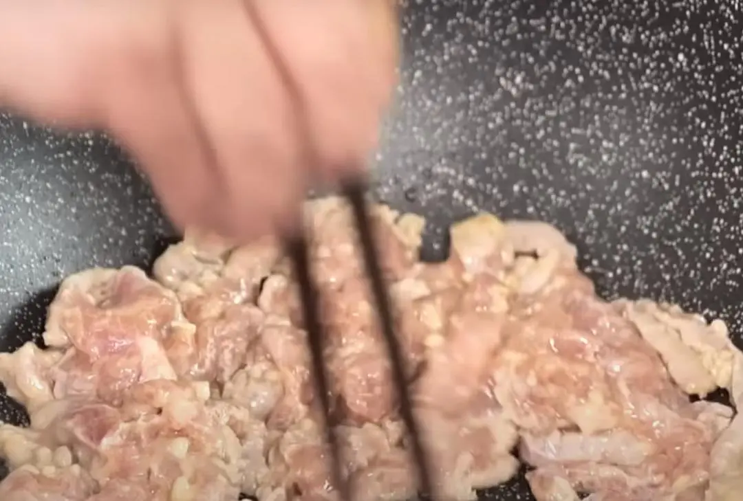 2、以略多的油热锅,用筷子将里肌肉条搅散,大火炒香后滤油备用。