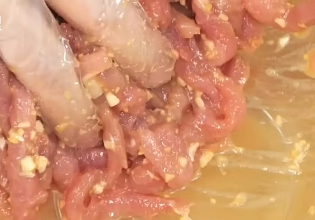 1、青葱与辣椒都切成丝状,泡入冷水再滤干备用。里肌肉切成小条状,放入腌料抓匀,接着少量分次加水(图中示范约15ml共4次)搅拌至水分吸收,最后加太白粉抓匀静置约15分钟。