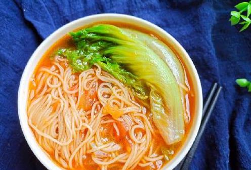 西红柿因富含维生素而具有清热生津等功效,早餐搭配西红柿不仅增添营养,还能养肝健胃。将西红柿去皮切块,爆香后加入调料翻炒至软烂,再加蔬菜和面条煮熟即可。